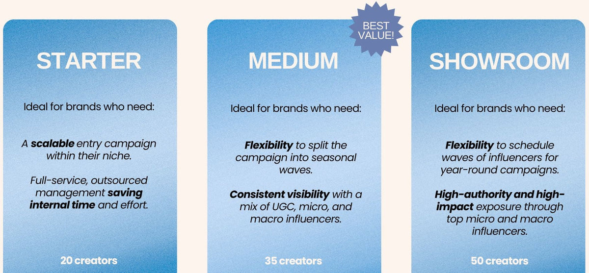 Use your influencer package across multiple launches, time periods, or audience segments.